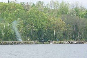I noticed a campfire and people fishing